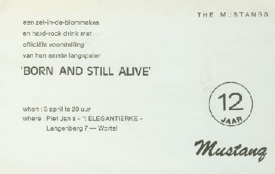 After two years of hard work the album, “Born And Still Alive” was finally released on April 3th, 1977 with a special show at their favourite club: the “Eglantierke” in Wortel. First there was a projection of some old Mustang-films and after that, they played the album in a 45 minute set.